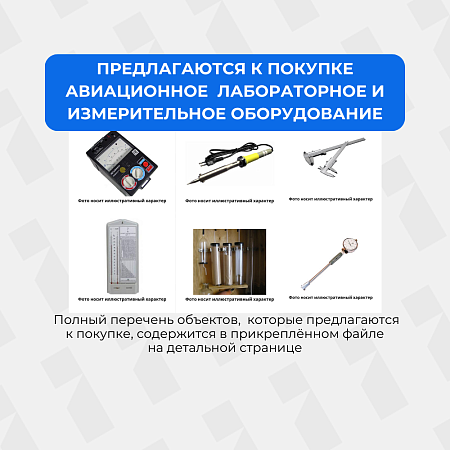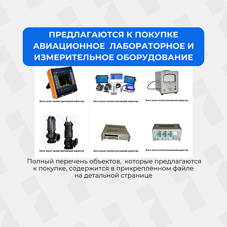 Предлагаетсяизучение спросаПредлагается к покупке авиационное лабораторное и измерительное оборудование. Полный перечень оборудования, которое предлагается к покупке, содержится в файле в разделе "Документы по предмету торгов". Возможна покупка запчастей одного наименования в представленном количестве. Видеоэндоскоп Andronic FMA-8.0-2 Выпрямитель ВСС-10 Генератор Г3-109 Генератор Г4-116 Генератор Г4-76А Генератор Г5-54 Дефектоскоп МД-М (магнитопорошковый) Дефектоскоп ультразвуковой УД2В-П46 Изделие М3-3А Измеритель Х 1-93 Комплект визуально-измерительного контроля ВИК-1 Комплект оборуд-ия "Кристалл-15Ф" очиститель у/зв очистки ф/э "Кристалл-15Ф", ванна для замачивания Мегомметр Е6-16 Модульный выпрямитель "Форпост" Наземный комплекс "Топаз-МГА" Рабочая станция мобильная/программное обеспечение "СКАТ" для обработни Осциллограф С1-114 Переносной дефектоскоп МПД-1 Повер аппар.КСР-5м Проверочная аппаратура Стенд УСР-6А Тестер Т-1 Тоновихр. дефектоскоп ТВД Установка КТУ-1м Установка УКАМП - ИВД Установка УКАМП-ИВД Установка УКАМПИВД Установка УПГ-48 Установка УПЗ-АОС-81 Установка УПП-1 Установка УПТ-48м Установка УТП-1М Установка УЭГП-1 Установка ЭУПМ-2м Установка ЭУПМ-2м Установки УПК-3 Частомер Ч2-6А Частотомер электронно-счетный Ч3-84/2 Аппарат КСР-5м Вольметр В-7-32 Вольтметр В-7-32 Вольтметр В-7-32 Вольтметр В7-22А Вольтметр В7-26 Вольтметр В7-38 Генератор Г-5-72 Генератор Г4-144 Генератор Г4-93 Генератор Г5-54 Генератор Г5-54 Генератор сигналов Г3-118 Генератор сигналов Г4-102 Дефектоскоп Дефектоскоп Дефектоскоп Полет ИКУ звуковых Изделие ВСС-10 Изделие Е7-11 Изделие ИРК-2 Изделие КСР-5 Изделие ПКО-2 Изделие ПКО-2м Измеритель В3-44 Измеритель М-3-5А Имитатор МиП-48 Испытатель Л-3-3 КПА-ИВС Милливольтметр ВЗ-55 Миллиомметр Е6-15 Мост Е7-11 Омметр Е6-13 Осциллограф С1-69 Прибор В3-44 Прибор ПКО-2 Прибор Х-1-42 Прибор Х-1-48 Система стекол, перем. прозрач. ССПП-2 Тестер Т-1 УЭГП-1 Установка КПА ИВД Установка КПА-ПВД Установка КПА-ПВД Установка КТУ-1М Установка УПАОС-М Установка УПЗ-АОС-81М Установка УПК-3 Установка УПТ-48 Устройство зарядное Р-838 Устройство зарядное Р-838 Частомер Ч3-33 Частомер Ч3-54 Частомер ЧЗ-45 Частомер ЧЗ-54 Частотомер Ч-3-45. -