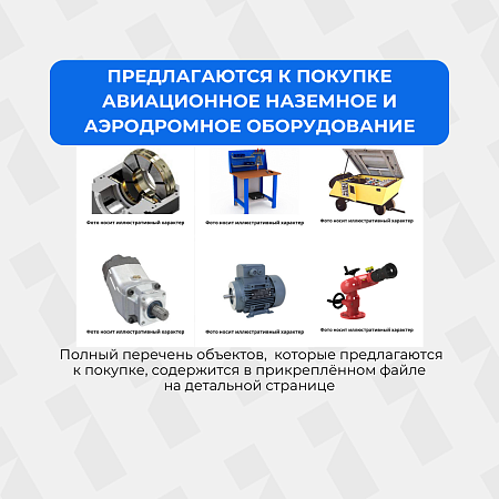 Предлагаетсяизучение спросаПредлагается к покупке авиационное наземное и аэродромное оборудование. Полный перечень оборудования, которое предлагается к покупке, содержится в файле в разделе "Документы по предмету торгов". Возможна покупка запчастей одного наименования в представленном количестве. Авиационная стремянка ВС СА-4/15Б-Н1-М Аптечка Аэродромный выпрямитель АВ-2МБ №6 Буксировочн. тросс У-9120 Верстак слесарный Верстак слесарный Верстак слесарный Водило 24-9103 Водило 32.029932.100 АН-24 Водило А310760000 Водозапр. агрегат Выпрямитель АВ-2 Гидродомкрат Гидроподъемник А-40-0600-05 АН-24 Гидроподъемник АН-24 Гидроподъемник АН-24 Домкрат (инв.№41100) Кабельная тележка Козелок 63740-119 Козелок 63740-119 Козелок 63740/119 Колодка 210СГ Колодка 210СГ Колодка 210СГ Колодка 210СГ Колонка СК - 4 Компрессор МТ-10 Кран КН-1 Кусторез Кусторез FS4502,1 кВт/2,9 л.с. (с ножом для мол300 3 20, кос. гол. AutoCut 46-2, пильным диском и уп Минимойка высокого давления Моторный подогреватель МП-70 М.А Нагреватель на отработанном масле Master WA 33 РП Наземное оборудование Ми-2 Осветит. установка ПОУ-3 Перрон. аптечка Подогреватель "Север" Подогреватель УПВ-1 Подогреватель УПВ-1 Подогреватель ЭПД-2 Приспособление 154009056000 Сварочный аппарат Сварочный полуавтомат Magster-330 4*4 Польша Станок заточный Станок сверлильный Станок сверлильный Станок токарный Стремянка Стремянка Стремянка Стремянка Стремянка Стремянка Стремянка Стремянка Стремянка Стремянка Стремянка 24-9012-0 (инв.№41256) Стремянка 24-9012-0 (инв.№41257) Тележка АШ-62 Тележка АШ-62 Тележка К 412 Упорн. колодка Упорн. колодка Упорн. колодка Упорн. колодка Установка АЭМГ-50 (инв.40025) Установка жидкости Арктика ФЗА-3 ФЗА-3 ФЗА-3 ФЗА-3 ФЗА-3 ФЗА-3 ФЗА-3 ФЗА-3 ФЗА-3 ФЗА-3 ФЗА-3 ФЗА-3 ФЗА-3 ФЗА-3 ФЗА-3 ФЗА-3 Электроагрегат АСДА-200-Т/400-3Р Бензокосилка Husqvarna 153R Жидкотопливный воздухонагреватель Gryp 25Ар Изделие "Беркут" Изделие "Беркут" Котел КЧ 10-58Т "Немига-1" Насос К 90\20 Подогреватель ИП-40 Приспособление 154009956045 Таль электрическая Трансформ. ТО 282\22 Указатель уровня жидкости "Мирон" Электродвигатель 3квт -