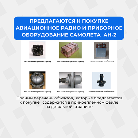 Предлагаетсяизучение спросаПредлагается к покупке авиационное радио и приборное оборудование самолета АН-2. Полный перечень оборудования, которое предлагается к покупке, содержится в файле в разделе "Документы по предмету торгов". Возможна покупка запчастей одного наименования в представленном количестве. Авт.АЗС-2, АЗС-30, АЗС-20 Автомат АЗСГ-15 Автомат АЗСГ-2 Автомат АЗСГ-20 Автомат АЗСГ-25 Автомат АЗСГ-5 Автомат АЗСГ(К)-10 Автомат АЗСГК-10 Автомат защиты АЗР-30 К Арматура СЛМ-61 белый Арматура СЛМ-61 желтый Арматура СЛМ-61 зеленый Арматура СЛМ-61 красная Арматура СЛЦ-77 желтый Арматура СЛЦ-77 белый Арматура СЛЦ-77 зеленый Арматура СЛЦ-77 красный Арматура СЛЦ-77 синий Вилка 27в Клемная колодка 74 К Клемная колодка 75 К Переключатель 2ВГ 15(К) Переключатель 2ПНГ-15 Переключатель ПМ-1 Переключатель ПНГ-15 Переключатель ППГ-15 Переключатель ППГ15к Переключатель ППН-Т(К) Переключатель ПСВ-УМ Переключатель СПУТ1-5 Предохранитель ИП-100 Предохранитель ИП-150 Предохранитель ИП-75 Предохранитель СП-2 Предохранитель ТП-400 Предохранитель ТП-600 Проводка ВЧ Светофильтр красный аэродромный Абоненский щиток Абонент.Ап-т СПУ-7 Абонентский щиток Абонентский щиток СПУ-7 Авиагоризонт АГК-47Б Авиагоризонт АГК-47Б Авт.АЗС-2, АЗС-30, АЗС-20 Автомат А-812 Автомат АД-50 Автомат АЗ СГК-50 Автомат АЗСГ-2 Автомат АОС-81 Автомат АОС-81М Автомат АОС-81М Автомат АОС-81М Автомат защиты АЗП-8М 6с Автомат защиты АЗП-8М 6с Автомат защиты АЗП-А2 Автомат защиты АЗР-3 Автомат защиты АЗСГ-30 Автомат защиты сети АЗС-10 Автомат защиты сети АЗС-15 Автомат защиты сети АЗС-2 Автомат защиты сети АЗС-20 Автомат защиты сети АЗС-25 Автомат защиты сети АЗС-5 АГК-47В АКБ "VARTA" Амперметр А-1 Амперметр А-1 Амперметр А1 Амперметр А3 Амперметр АФ-1-150 Ант. фильтр АФ-1 Антенна Аз-019 (СОМ-64) Антенна АМ-001 (СОМ-64) Антенна РВ-УМ Арматура АРУФ-45 Арматура БАНО Арматура белая Арматура желтая Арматура зеленая Арматура красная Арматура синяя Арматура ХС 39 Барограф АД-2 Барограф АД-2 БИ2АЮ блок Блок антенный Блок антенный АРК-9 Блок АРК У2 Блок БИ-2АЮ Блок БКК-18 Блок БКК-18 Блок БКК-18 Блок БКК-18 Блок БПК АРК-9 Блок БС-01 (ДИСС-013) Блок БС-2 (ДИСС-013) Блок БУФ-5185 Блок ГР-2БМ Блок ГР-2БМ Блок ГР-2БМ Блок ГР-431 Блок ГР-431 Блок ГР-431 Блок ГР-4ДВ Блок направл. антенны АРК-9 Блок направлен. антены АРК-9 Блок направленной антенны Блок НЧ "ДИСС-013" Блок питания АРК9 Блок питания МРП 56П Блок СК (КурсМП-2) Блок УН-2П (КурсМП-2) БП МРП 56П БСУШ-2 ВАР-30МК ВАР-30МК Вариометр ВАР-30 Вариометр ВР-10 Вентилятор ДВ-201 Вентилятор ДВ-201 Вентилятор ДВ-302Т Вентилятор ДВ-302Т Вилка 27в Вилка ВШ Вилка ШРА-250 ЛК ВК-53РШ Вольтамперметр ВА-3 Вольтметр ВФ-150 Вольтметр ЭВ-46 Вольтперметр ВА-3 Выкл. коррекции ВК 53РБ Выкл. коррекции ВК-53 Выкл. коррекции ВК-53РБ Выкл. коррекции ВК-53РБ Выключатель 2ВГ-15к Выключатель ВМ-117 Выключатель ВМ-177 Выключатель ВМ-177 Высотомер УВИД-30-15+/БУ-1 Высотомер УВИД-30-15Кс2+/БУ-1 Высотомер УВИД-30-15Кс2+/БУ-1 Героагрегат ГА-3 Героагрегат ГА-3 Гироагрегат Г-3М Гироагрегат Г-3М Гироагрегат Г-3М Гирополукомпас ГПК-48 Гирополукомпас ГПК-48 Гирополукомпас ГПК48 Гирополукомпас ГПК48 Гироскоп ГА-1М с2 Гироскоп ГА-1М с2 Гироскопический агрегат Г-3М Гироскопический агрегат Г3М Глиссадный приемник ГРП-66 Глиссадный приемник ГРП-66 Глиссадный приемник ГРП-66 Дальномер СД-67 Датчик бензиномера "КН"СБЭС-1447 Датчик бензиномера "КС"СБЭС-1447 Датчик бензиномера "Ц"(СБЭС-1447 Ц") Датчик бензиномера "Ц"СБЭС-1447 Датчик гироиндукционного компаса ИД Датчик дав
