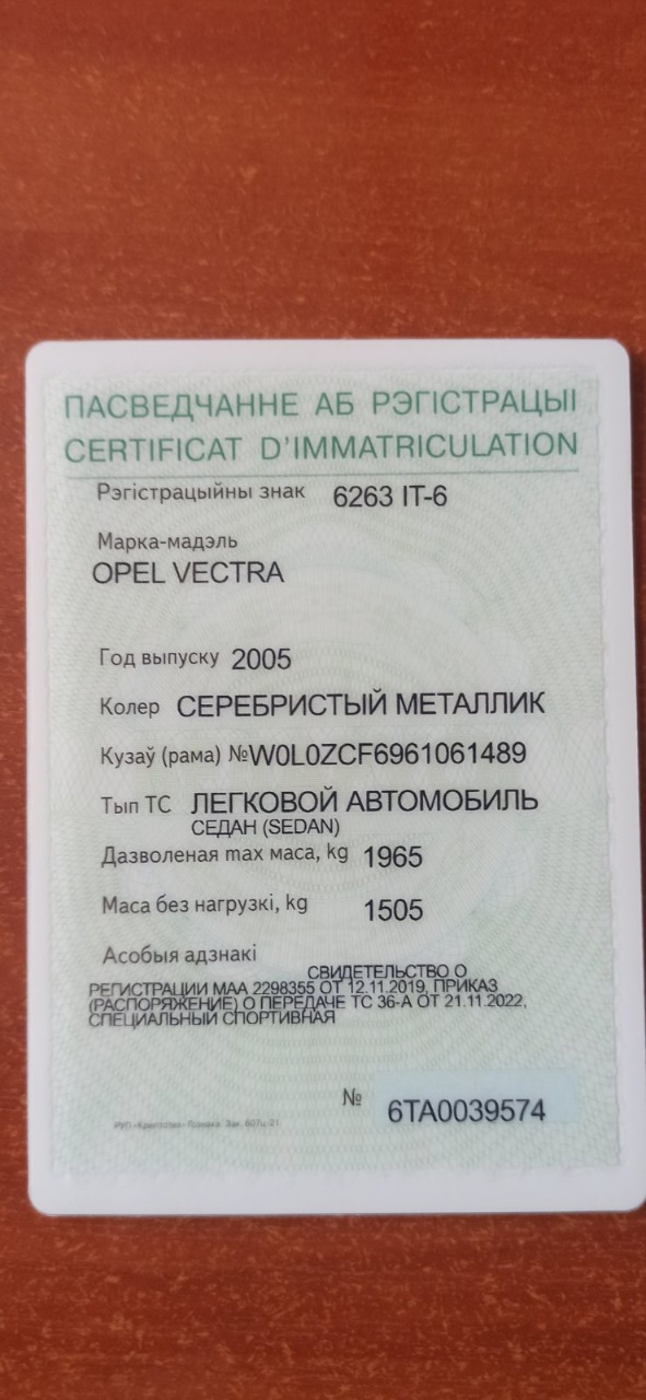 Характеристики (назначение, описание составных элементов и иное)тип кузова – седан, кузов (рама) №W0L0ZCF6961061489, регистрационный знак – 6263 IT-6, год вы-пуска – 2005) с комплектом шин Tigar Winter 205/55R16 94H.